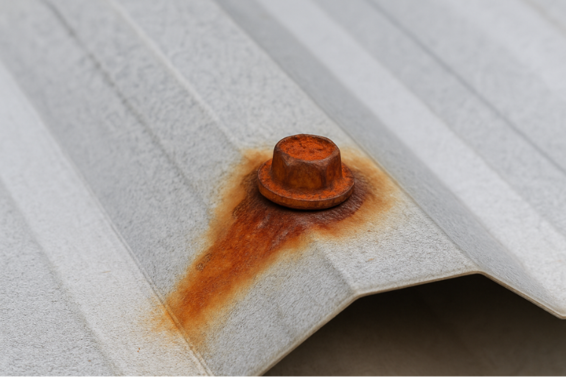 สกรูคุณภาพต่ำมักใช้ผิวชุบที่บาง ไม่ได้มาตรฐาน หรือชุบไม่สม่ำเสมอ จึงเกิดสนิมภายในเวลาไม่นาน โดยเฉพาะบนหลังคาที่โดนแดดและฝนตลอดทั้งปี