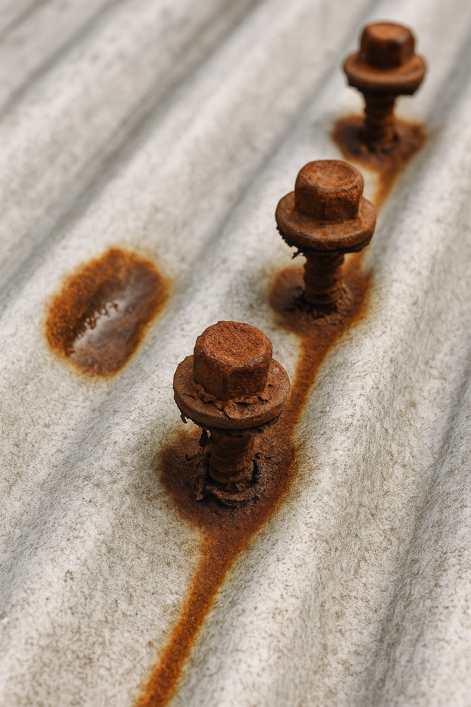 หากสกรูเป็นสนิม แสดงว่าผิวชุบเริ่มเสื่อม และน้ำเริ่มกัดกร่อนจุดยึด โดยเฉพาะสกรูที่ไม่ได้ใช้ ชุบดาร์โก้ Class 2 ซึ่งเป็นผิวชุบที่ทนสนิมที่สุดสำหรับงานหลังคาเมทัลชีทในไทยสัญญาณเตือน