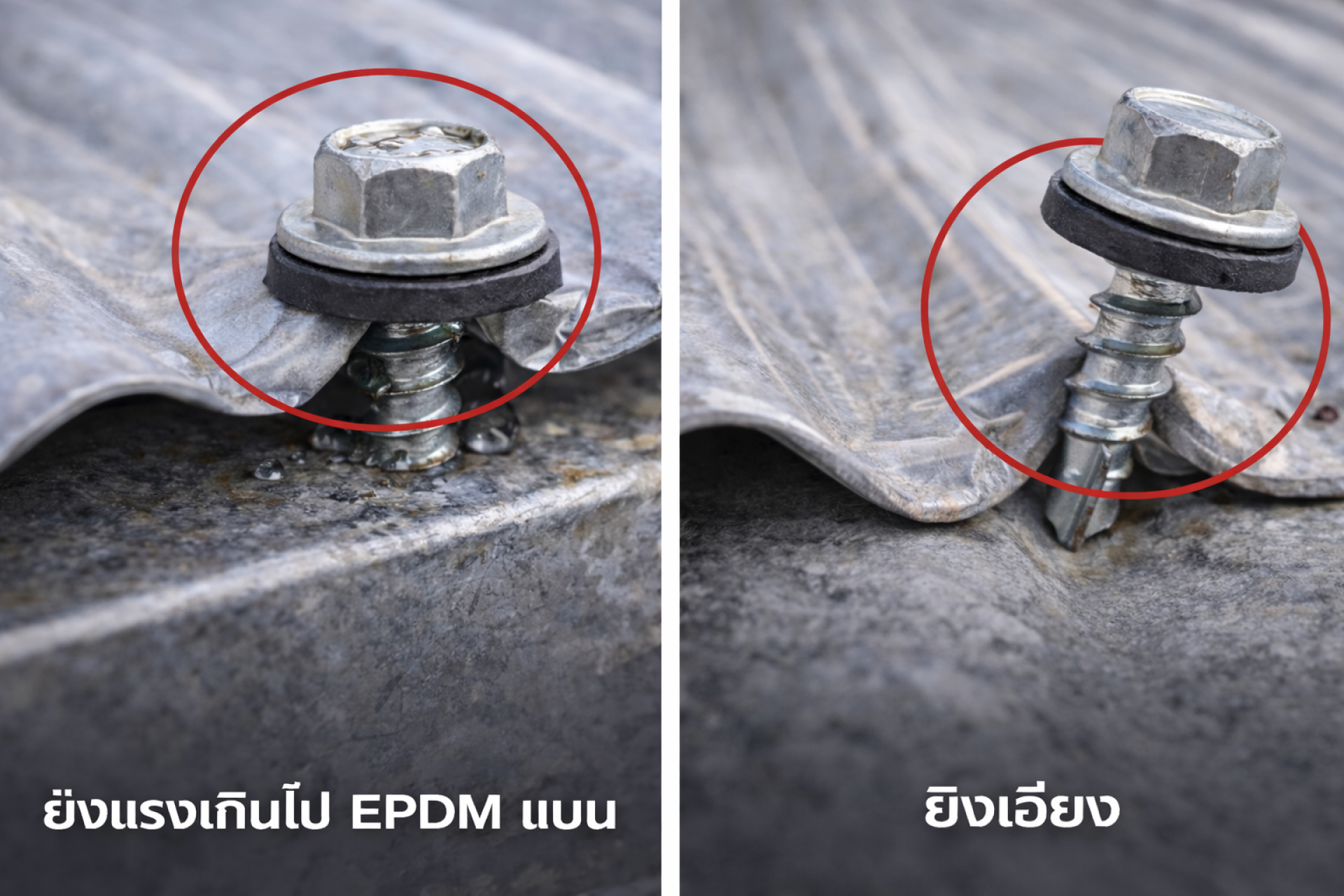 ผู้รับเหมามือใหม่มักเข้าใจผิดว่ากดยิ่งแรง = ยิ่งแน่นแต่ในงานหลังคาเมทัลชีท หากกดสกรูแรงเกินไป จะเกิด: